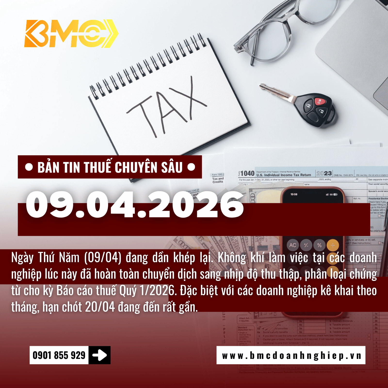 Ngày Thứ Năm (09/04) đang dần khép lại. Không khí làm việc tại các doanh nghiệp lúc này đã hoàn toàn chuyển dịch sang nhịp độ thu thập, phân loại chứng từ cho kỳ Báo cáo thuế Quý 1/2026. Đặc biệt với các doanh nghiệp kê khai theo tháng, hạn chót 20/04 đang đến rất gần.